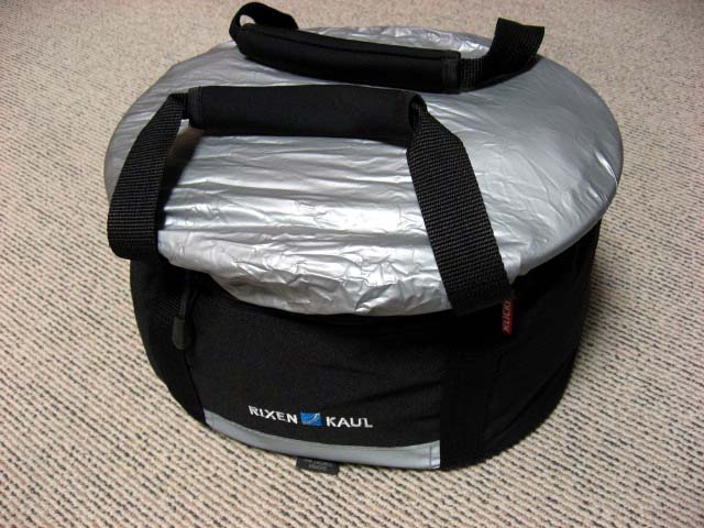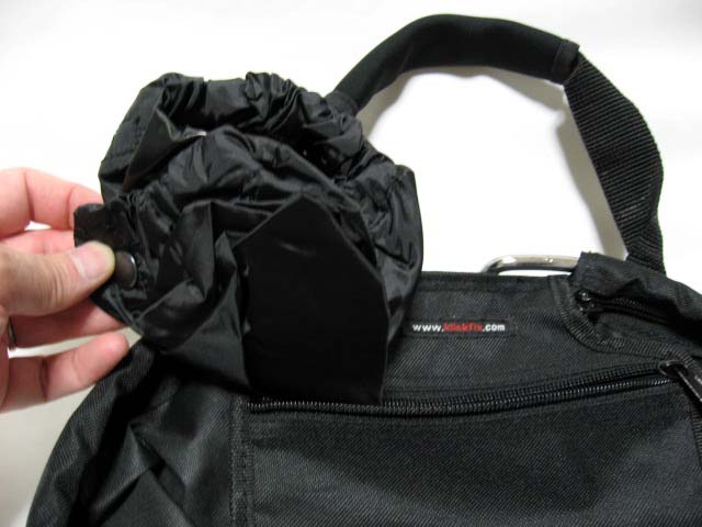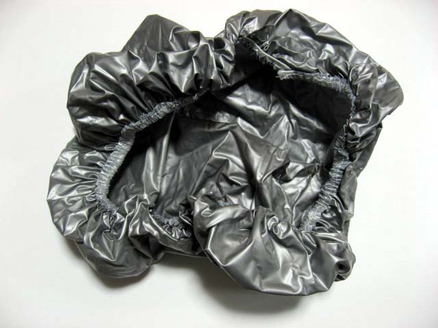 ところで、このカバンをいろいろいじっているうちに素晴らしい発見をしました。このレインカバー、割と薄手で、なくしたり破れたりするのが心配なのですが、ダイソーなど100円ショップで 100円で2枚セットで売っている「自転車用シートカバー」(雨の時などにサドルに被せるやつ)、