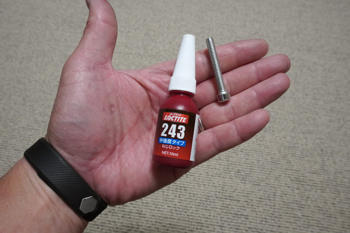 今回取り付けるブレーキブースターは、樹脂製のスリーブで、ブレーキ本体から離されて装着されます。そのため装着ボルトに大きなトルクをかけて固定することができません。そこで今回利用したのがボルトのゆるみ止め液。この製品は「中強度」のため、ゆるみ止めの機能を保ちつつ、取り外す際の障壁にはなりません。