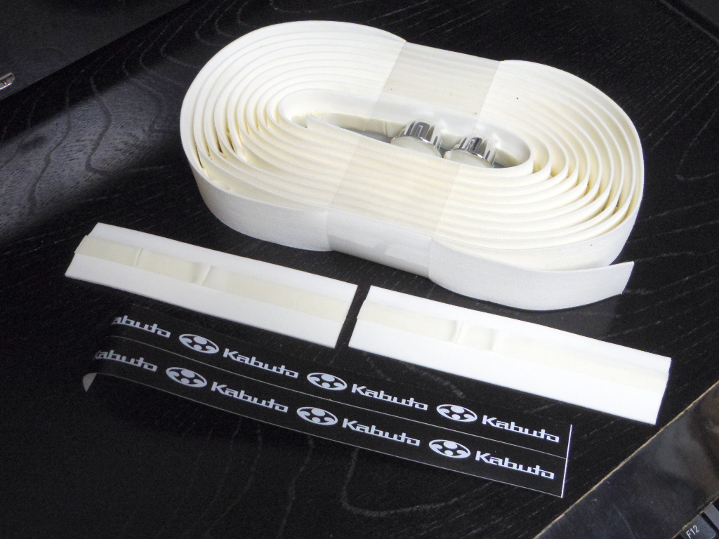 パッケージの中身は、バーテープ本体(2本)とブレーキ・レバー取付バンドカバー用のバーテープ(2本)、ビニールテープ(2本)、バーエンド・キャップ(2個)です。