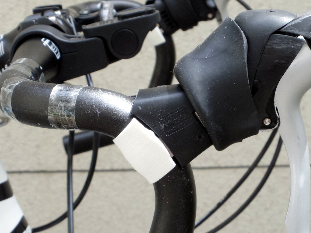 さらに、パッドの段差の部分を埋めるように、余ったバーテープをハンドル中央部に足しておきます。巻きあがりの径が太くなることが予想されますが、覚悟の上なので気にせず実行します。