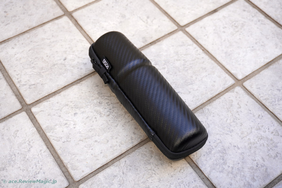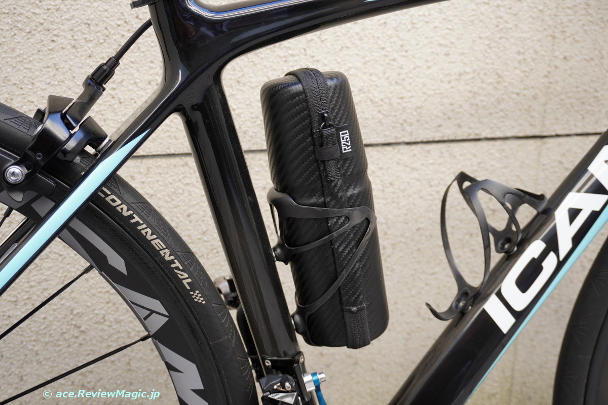 カーボン・ロードバイクに合わせるように、外装はカーボン調のもの。ボトルケージにもぴったりとはまります。