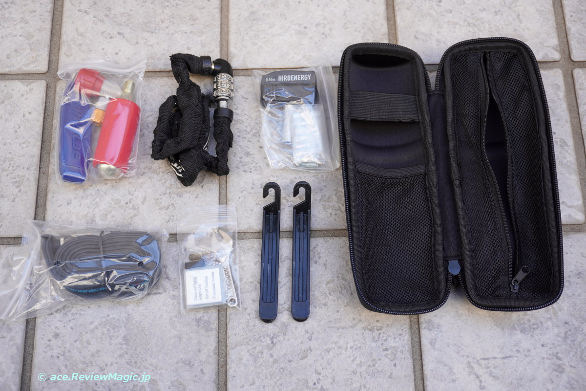 案外収納力があって、これだけのもの(予備チューブ、パンク修理セット、チェーンロック、携帯型トルクレンチ等)が入り、なお余裕があります。