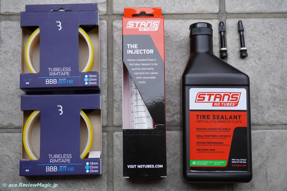 その他、「シーラント」というリムとタイヤビードとの隙間をふさぐ液体やチューブレス用バルブが必要になります。早速購入しました。