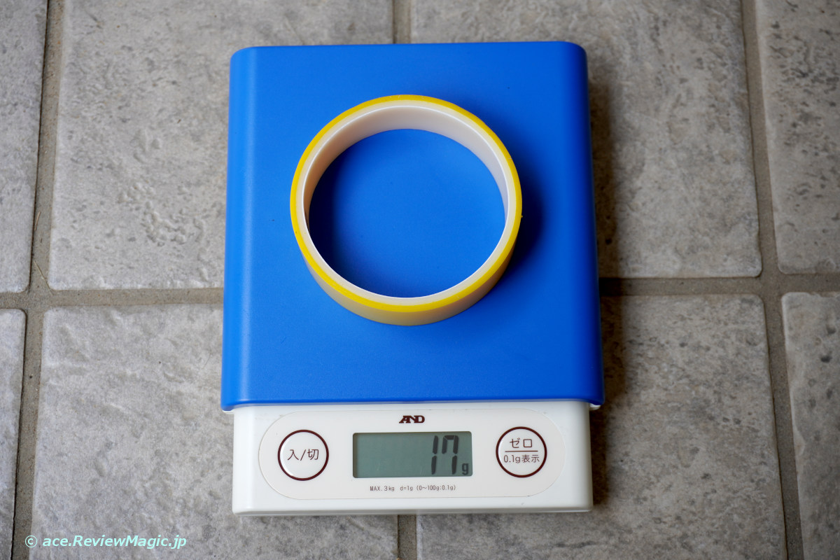 今回利用した BBB の 22mm 幅チューブレス用リムテープの重量は、17g でした。通常のリムテープの中では軽量な部類に属する SHIMANO の 16mm リムテープが一本 16g なので、十分軽量だと思います。