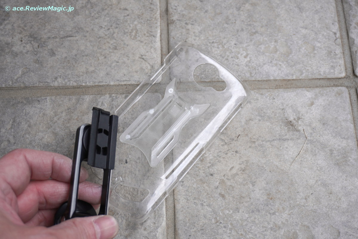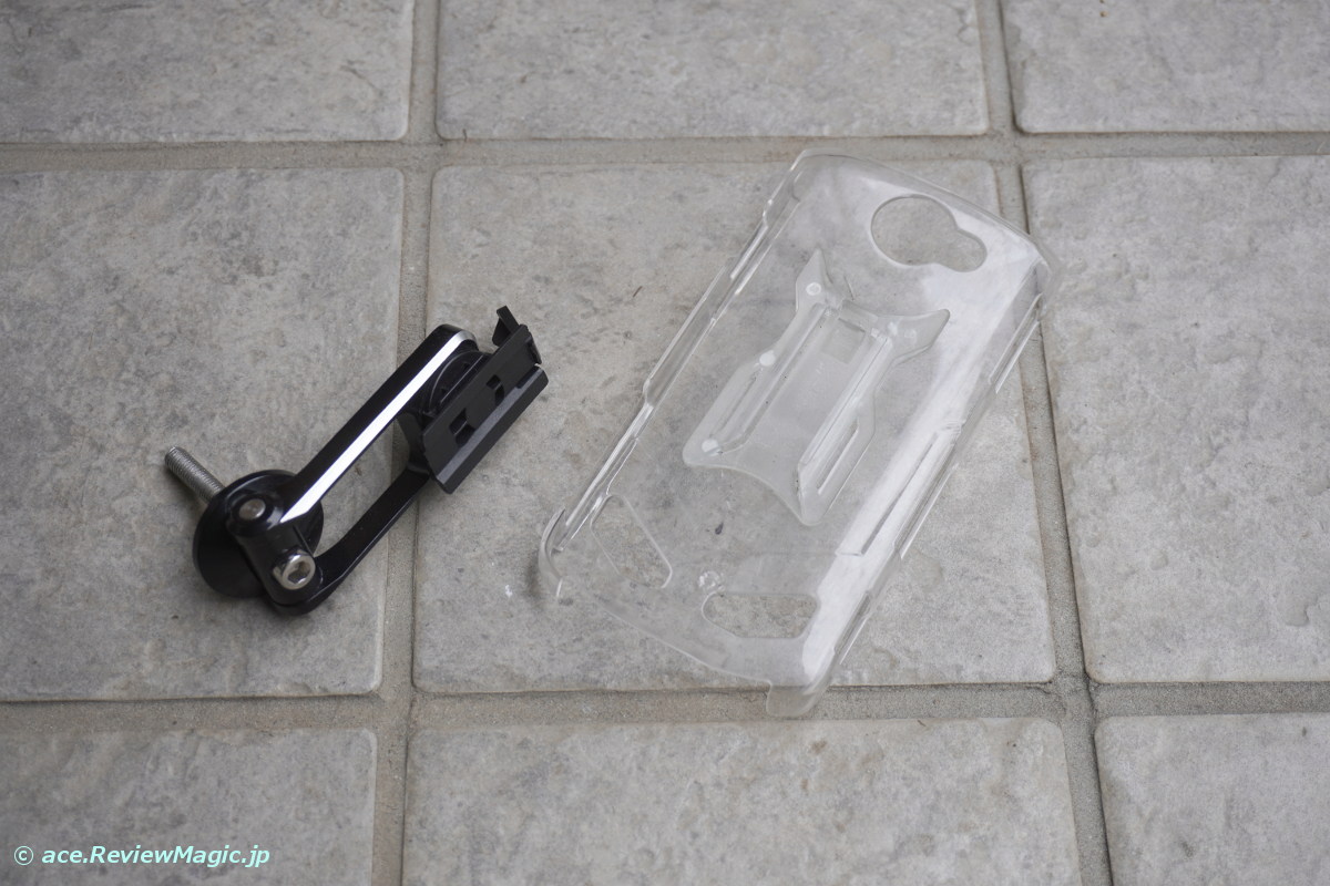 本製品を利用するためには、スマフォ取付用のケースの調達が別途必要です。スマフォの形状は様々で、そのケースはスマフォの型番毎に異なります。したがって、本製品を利用する場合、取付対象のスマフォを一つに決める必要があります。私は、この製品を利用するにあたって、防水型でタフさを備える「京セラの Torque」を対象スマフォにしようと決めていたので、それ用のクリアケースを購入して使いました。対象スマフォが防水型ならば防水型のケースをする必要がないため、片面開放型のクリアケースを使っても雨による被害を心配しなくてすみます。これは操作性・視認性の両面で有利です。
