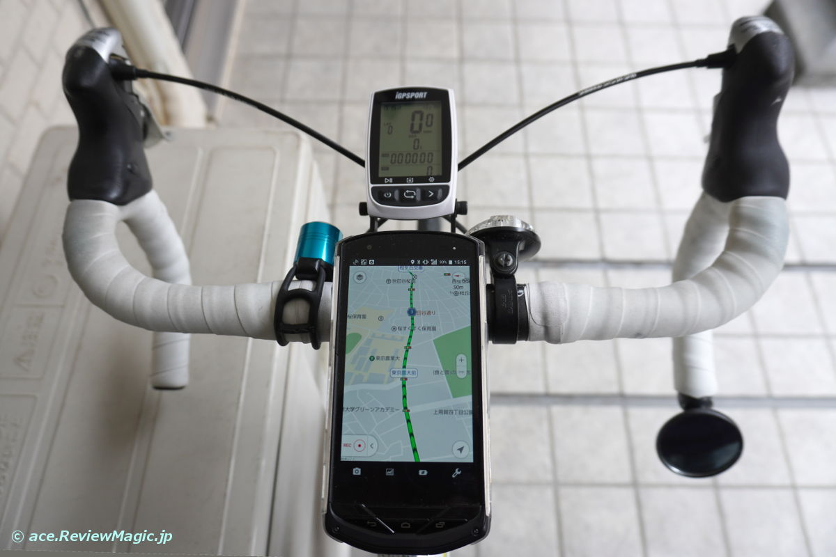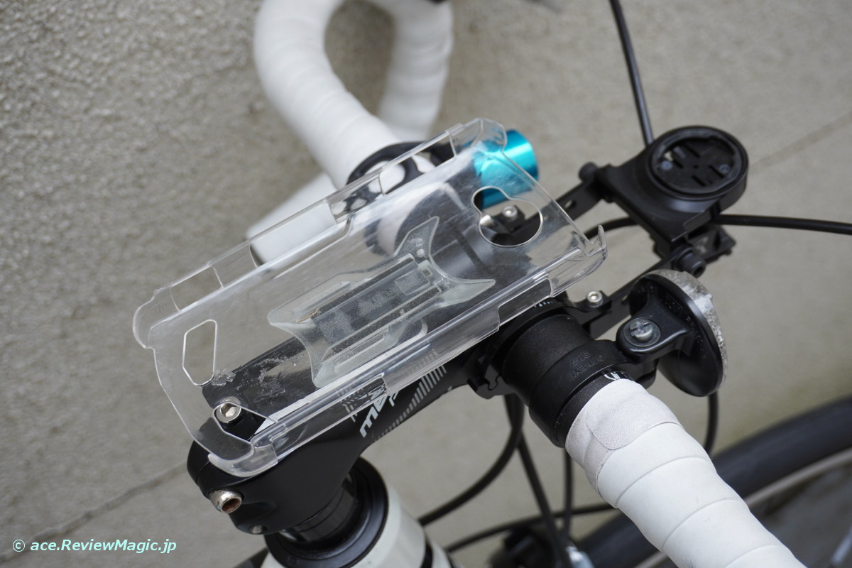 ロードバイクのステムにマウントするタイプのスマフォマウントを工夫して作成し、常用しています。 |