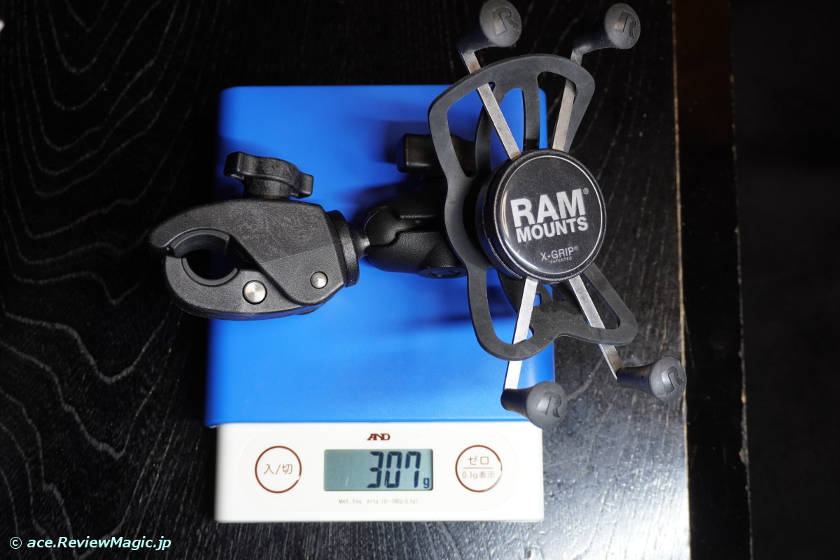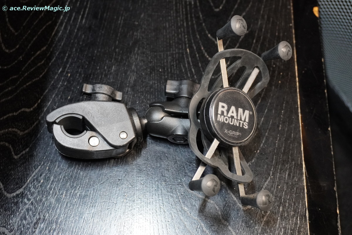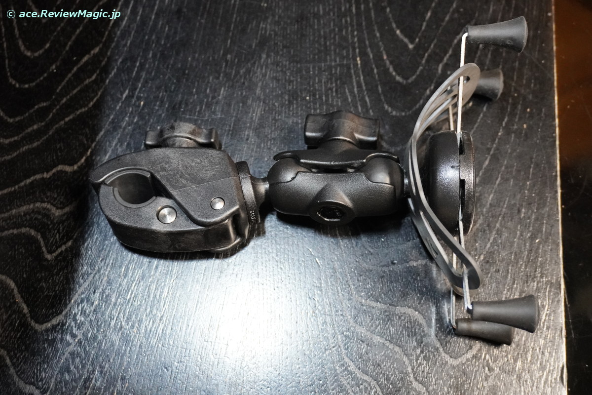 私が思うに、最高レベルにがっちりと固定できるスマフォマウントはこちら。RAMマウントの「Xグリップ(Lサイズ)」、「タフクランプ」、「ショートアーム」の3点セットです。