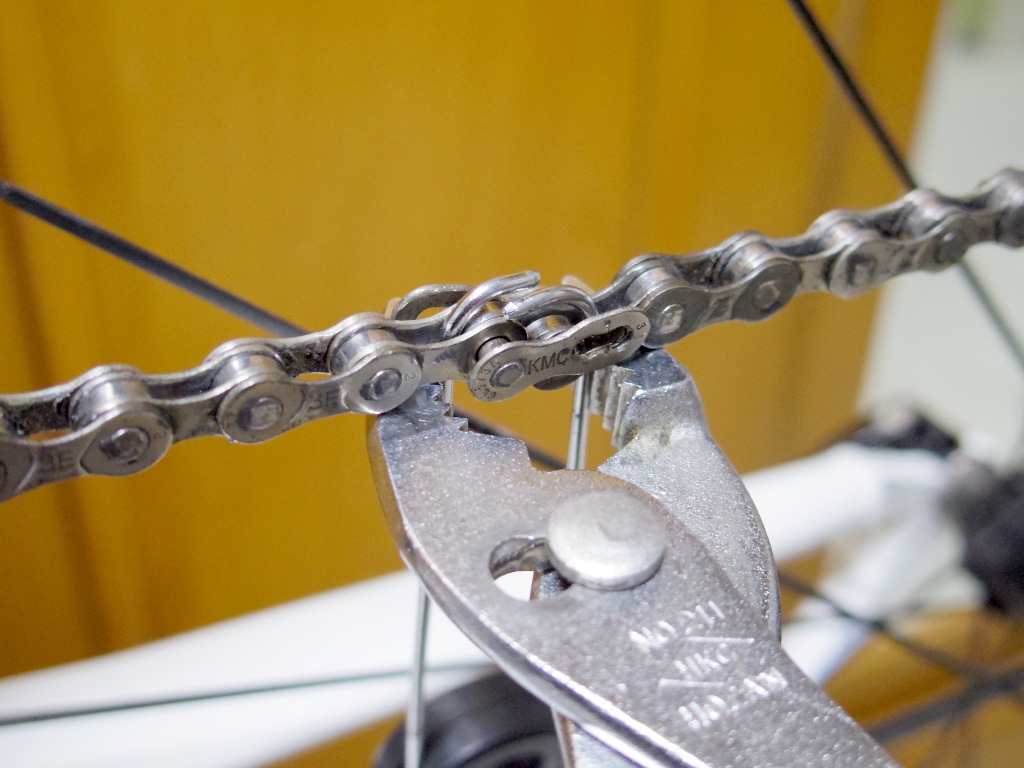 そこで、チェーンを徹底的に掃除するため、チェーンを自転車から取り外して「丸洗い」することにしました。ミッシング・リンクを使っているため、チェーン切りを使わなくてもチェーンを取り外すことができます。運が良ければ手でミッシング・リンクを外すこともできますが、今回は相当に固く、手では外れてくれないので、下記のようにバイシクル・チェーン・フックとプライヤー、ラジオペンチとの合わせ技で取り外します。