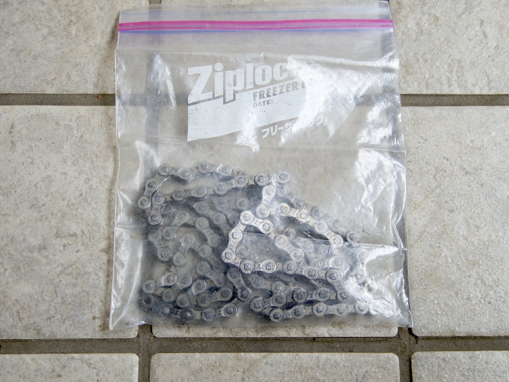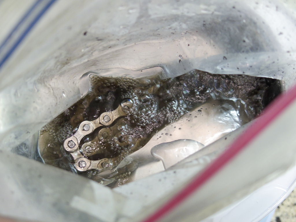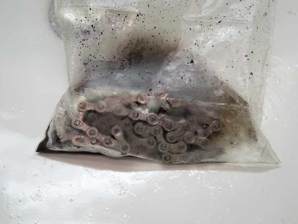 後は、ジップロックのチャックを閉じて、液が飛び出ないようにしてから、袋ごとチェーンを「シェイク」します。このシェイクで、チェーン内部の汚れも溶かしだしてしまいます。