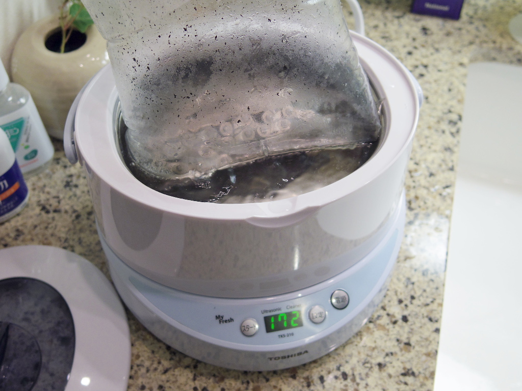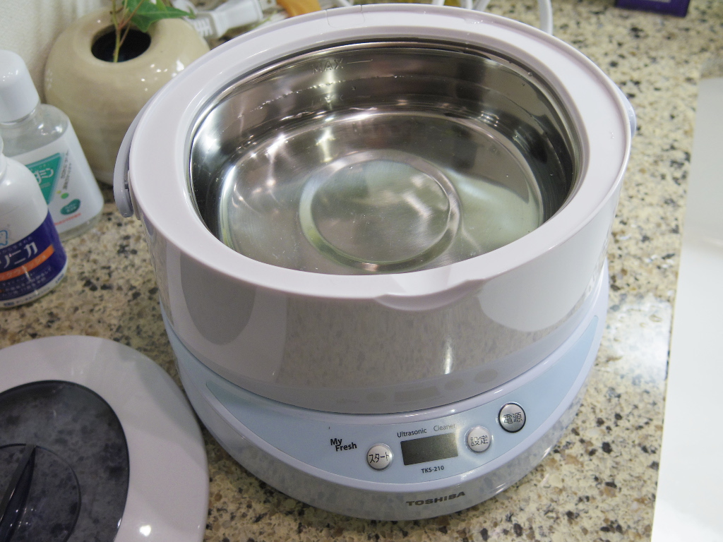 大抵は、以上までで十分チェーンはきれいになるのですが、本日は念を入れて超音波洗浄を行いました。私は、家庭用の超音波洗浄機「東芝 TKS-210」を持っています(参考: ブログでのTKS-210紹介ページ)。